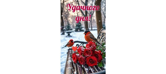 На заснеженной скамейке лежит букет алых роз и сидят две птички с красными грудками. Вверху надпись " Удачного дня!"