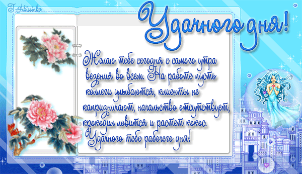 Удачного дня! Желаю тебе сегодня с самого утра везения во всем. На работе пусть коллеги улыбаются, клиенты не капризничают, начальство отсутствует, крокодил ловится и растет кокос. Удачного тебе рабочего дня!