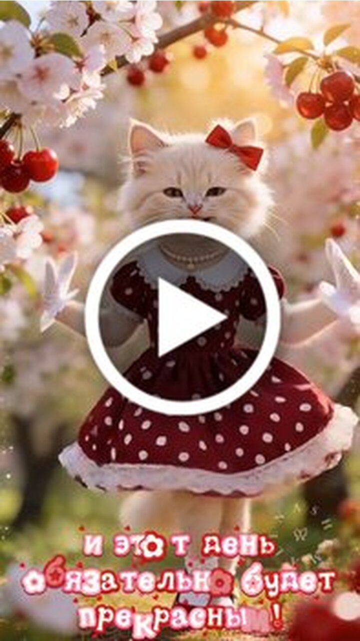В этом видео вы увидите очаровательного белого котенка в нарядном бордовом платье в белый горошек. Маленький персонаж украшен красным бантом и жемчужным ожерельем и грациозно танцует среди цветущих вишневых деревьев. На фоне видны сочные красные ягоды и нежные лепестки цветов. Видео наполнено вдохновляющими цитатами о том что нужно любить жизнь сегодня и создавать свое собственное прекрасное настроение. Это эстетичное и позитивное видео создано для того чтобы подарить вам улыбку и заряд бодрости на весь день.