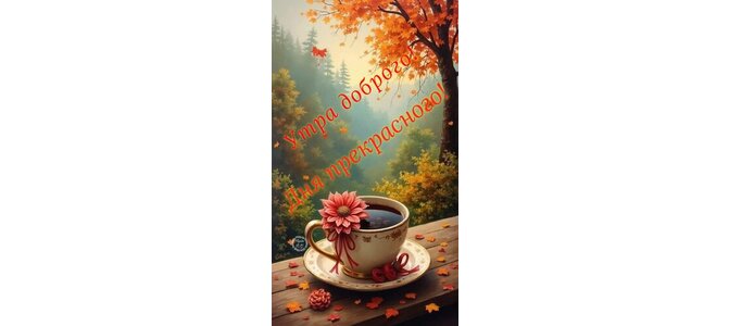 На скамейке на фоне осеннего леса стоит чашка с кофе.