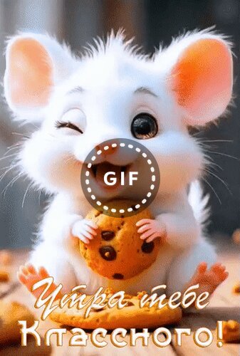 Милая и очаровательная белая мышка с большими ушами и веселым взглядом держит в лапках вкусное шоколадное печенье. На картинке изображен радостный персонаж, который подмигивает и широко улыбается, создавая позитивное и доброе настроение. В нижней части изображения расположена золотистая надпись на русском языке: "Утра тебе Классного!". Идеальное изображение для отправки друзьям и близким в качестве пожелания хорошего утра и отличного настроения.