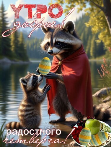 Цифровая иллюстрация в стиле праздничного открытка, на которой изображены два милых енота в живописном лесу у озера. Взрослый енот, одетый в ярко-красный плащ, с теплотой передает расписное пасхальное яйцо маленькому енотенку. На переднем плане видна корзинка с фруктами и яйцами. Надпись на русском языке «УТРО доброе! радостного рембера!» создает атмосферу уюта, сказки и праздничного настроения. Изображение наполнено мягким солнечным светом и детальной прорисовкой шерсти животных.