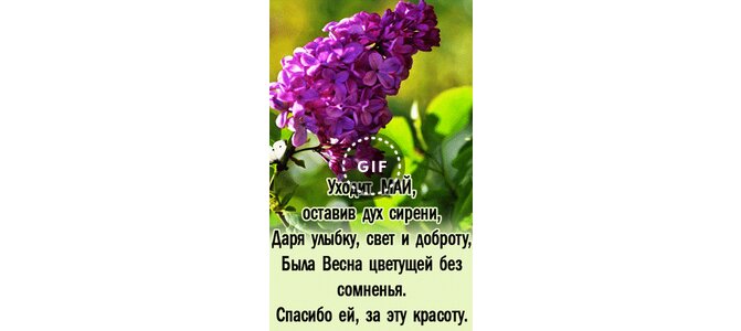 Анимированная открытка "Уходит Май, оставив дух сирени, даря улыбку, свет и доброту, была Весна цветущей без сомненья."