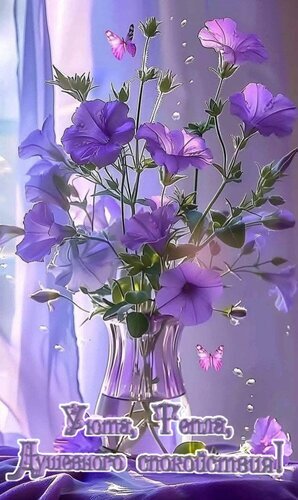 Красивое эстетичное изображение букета фиолетовых цветов (петуний) в стеклянной вазе на фоне нежных фиолетовых штор. Композиция дополнена парящими бабочками и сверкающими бликами света, создавая атмосферу умиротворения и мечтательности. В нижней части кадра расположена красивая надпись на русском языке: "Уюта, Тепла, Душевного спокойствия!". Идеально подходит для использования в качестве открытки, обоев на телефон или поздравительной картинки для создания настроения спокойствия и гармонии.
