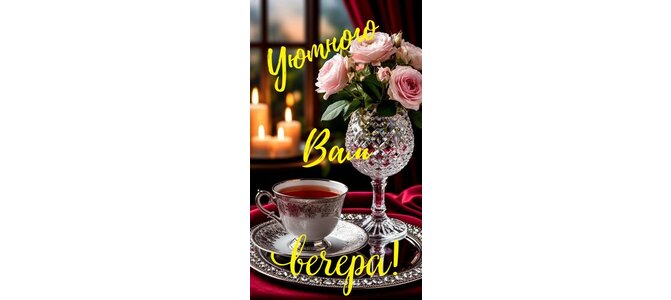 На маленьком столике, на подносе стоит чашка с кофе и небольшой букетик роз. На открытке написан текст" Уютного вам вечера!"