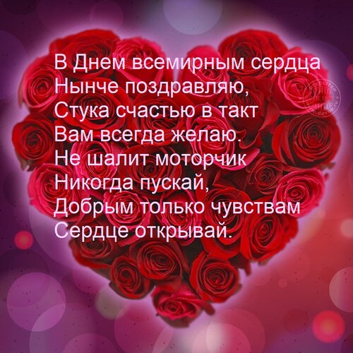 Открытка "В Днем всемирным сердца нынче поздравляю, стука счастью в такт вам всегда желаю. "