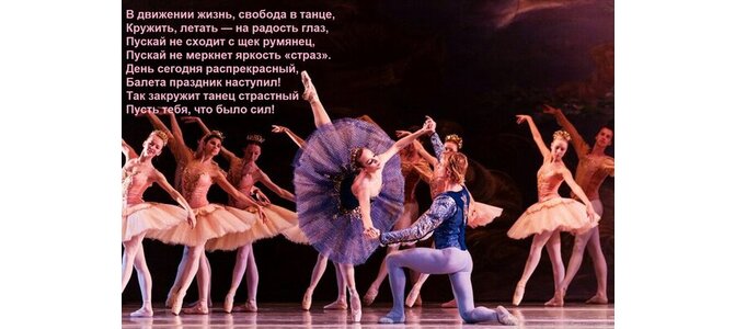Теги:в движении жизнь, свобода в танце, кружить, летать на радость глаз, пускай не сходит с щек румянец, пускай не меркнет яркость страз день сегодня распрекрасный, балета праздник наступил так закружит танец страстный пусть тебя, что было сил