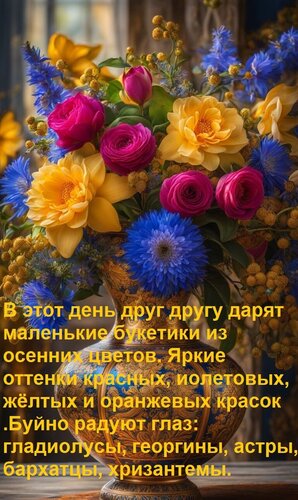 Открытка "В этот день друг другу дарят маленькие букетики из осенних цветов. Яркие оттенки красных, фиолетовых"