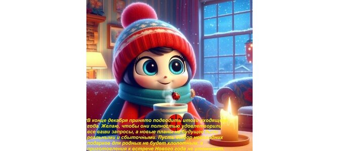 Теги:в конце декабря принято подводить итоги уходящего года желаю, чтобы они полностью удовлетворили все ваши запросы, а новые планы на будущее были реальными и сбыточными пусть выбор новогодних подарков для родных не будет хлопотным, а приготовления к встрече нового года не утомляют