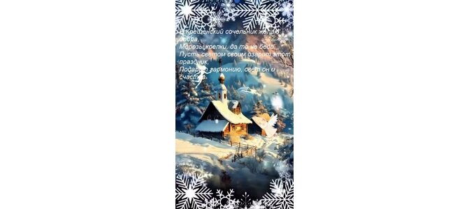 Теги:в крещенский сочельник желаю добра, морозы крепки, да то не беда, пусть светом своим озарит этот праздник, подарит гармонию, свет он и счастье