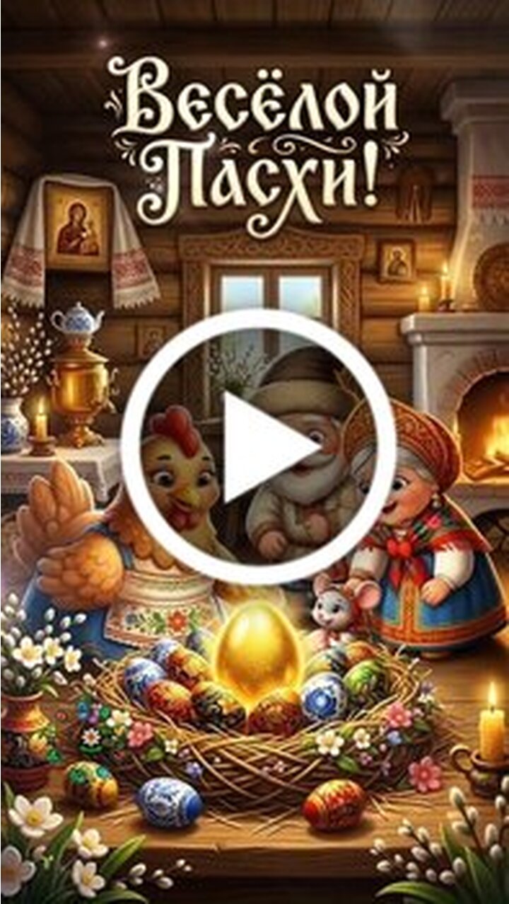 Красивое праздничное видео с поздравлением с Пасхой. В уютной деревенской обстановке сказочные персонажи дедушка бабушка и веселый цыпленок собираются за праздничным столом. В центре внимания находится большая корзина с яркими расписными пасхальными яйцами и золотистым куриным яйцом. Кадр наполнен атмосферой тепла и традиций с использованием праздничной атрибутики такой как кулич самовар и свечи. Видео завершается волшебными искрами и пожеланиями счастливого праздника. Это идеальное визуальное поздравление для создания праздничного настроения.