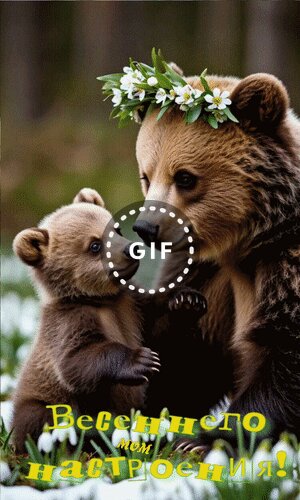 Милая и трогательная открытка с изображением мамы-медведицы и её медвежонка в лесу. На голове у медведицы красивый венок из белых цветов, что создает атмосферу весны и нежности. На картинке присутствует надпись на русском языке: «Весеннего настроения!». Изображение наполнено теплом, уютом и природной гармонией, идеально подходит для отправки друзьям и близким в качестве поздравительной открытки к весне.