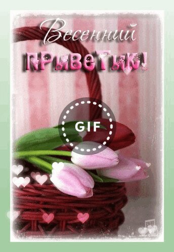 Красивая поздравительная открытка с весенним настроением. На изображении представлена корзина из темного лозы, наполненная нежными розовыми тюльпанами. Декор дополнен маленькими розовыми сердечками и стильной надписью «Весенний приветик!», выполненной каллиграфическим шрифтом. Картинка передает атмосферу тепла, радости и пробуждения природы, идеально подходя для отправки близким в качестве приятного весеннего пожелания.