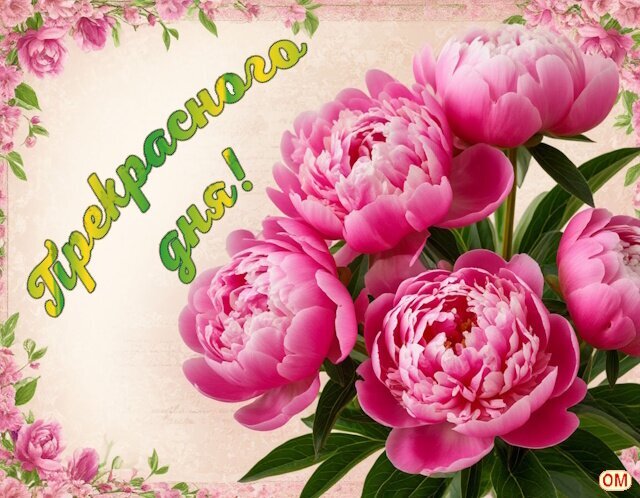 Красочное поздравительное изображение с пышными розовыми пионами. На картинке представлен великолепный букет нежных розовых цветов на светлом кремовом фоне, обрамленный цветочной рамкой. В левой части композиции расположена вдохновляющая надпись на русском языке «Прекрасного дня!», выполненная в декоративном зеленом стиле с желтым контуром. Изображение наполнено весенним настроением, свежестью и радостью, идеально подходит для использования в качестве открытки для пожелания доброго утра, хорошего настроения или просто приятного дня в социальных сетях и мессенджерах.