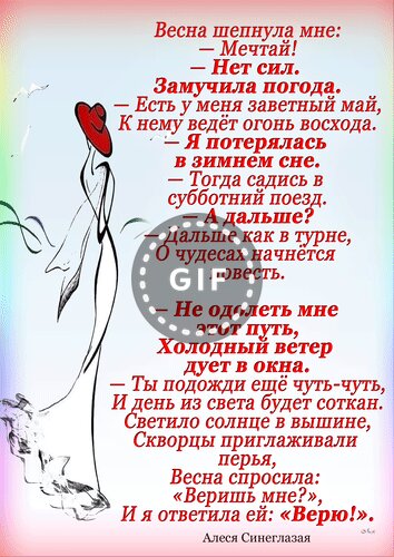 Весна шепнула мне: — Мечтай! — Нет сил. Замучила погода. — Есть у меня для счастья май, К нему ведёт огонь восхода. — Я потерялась в зимнем сне. — Тогда садись в субботний поезд... — А дальше? — Дальше как в турне, О чудесах начнётся повесть. — Не одолеть мне этот путь, Холодный ветер дует в окна. — Ты подожди ещё чуть-чуть, И день из света будет соткан. Светило солнце в вышине, Скворцы приглаживали перья, Весна спросила: "Веришь мне?", И я ответила ей: "Верю!". Алеся Синеглазая