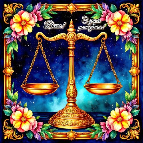Декоративная поздравительная открытка, посвященная знаку зодиака Весы. В центре композиции изображены золотые аптекарские весы на фоне глубокого синего ночного неба со звездами. Изображение обрамлено роскошной золотой рамой, украшенной яркими розово-желтыми цветами с зелеными листьями. В верхней части каллиграфическим шрифтом на русском языке написано: «Весы! С днем рождения!». Идеально подходит для использования в качестве цифрового поздравления для людей, родившихся под этим знаком зодиака.