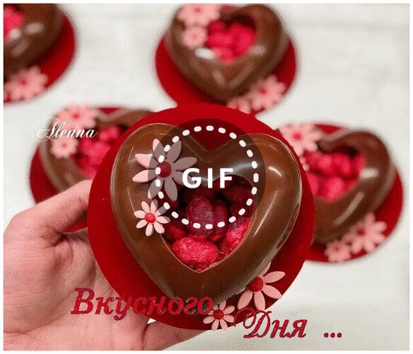 На фотографии крупным планом изображены изысканные шоколадные десерты в форме сердец, расположенные на красных подставках. Каждое сердце сделано из гладкого молочного шоколада с отверстием посередине, через которое видна яркая розовая начинка (возможно, сублимированная малина или ягоды). Десерты украшены нежными розовыми цветами из мастики или сахара. Композиция передает атмосферу праздника, романтики и любви. На переднем плане рука человека держит одно из сердец, создавая ощущение присутствия. Внизу видна надпись на русском языке «Вкусного дня...». Идеальное изображение для тематики кондитерского искусства, подарков на День святого Валентина или романтического завтрака.