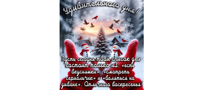 Теги:воскресенье, дни недели, снег, зима, новый год, подарки, снеговик, птички, женские руки, варежки, юмор, позитив