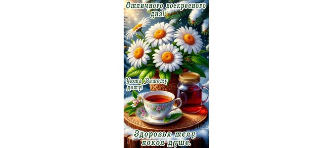 Теги:воскресенье, дни недели, цветы, ромашки, варенье, чай, чашка чая, зима, снег, здоровья, покоя, тепла и уюта, красивая картинка