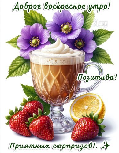 Красочная и жизнерадостная поздравительная открытка к воскресеньму. На изображении представлен аппетитный стакан кофе с пышной молочной пенкой, украшенный свежими ягодами клубники и долькой лимона. Фон дополнен нежными фиолетовыми цветами и зелеными листьями. Текст на русском языке: "Доброе воскресное утро! Позитива! Приятных сюрпризов!" Идеально подходит для отправки друзьям и близким в мессенджерах и социальных сетях для создания праздничного настроения.