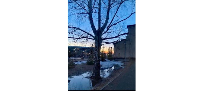 Рассвет, дерево, снег и лужа, восходящее солнце