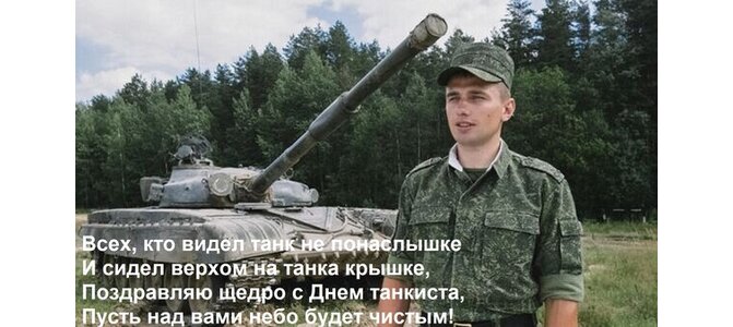 Всех, кто видел танк не понаслышке И сидел верхом на танка крышке, Поздравляю щедро с Днем танкиста, Пусть над вами небо будет чистым!