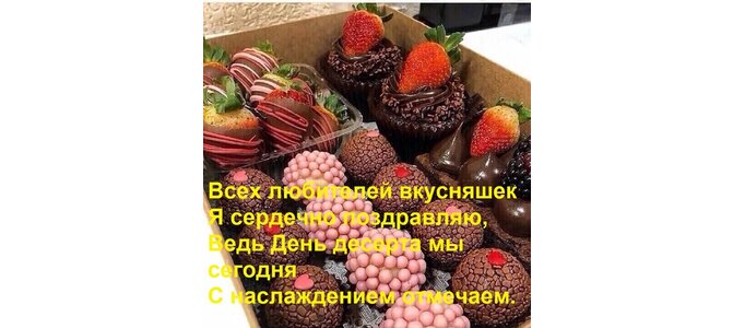 Открытка "Всех любителей вкусняшек Я сердечно поздравляю, Ведь День десерта мы сегодня С наслаждением отмечаем"