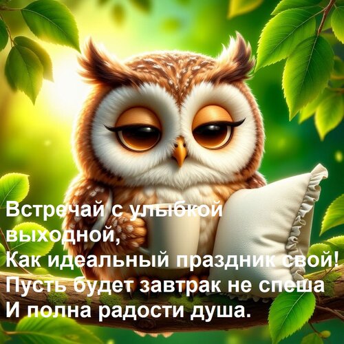 Открытка "Встречай с улыбкой выходной, как идеальный праздник свой! Пусть будет завтрак не спеша и полна радости душа."