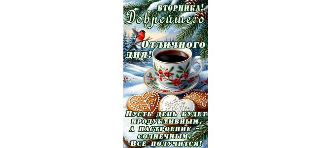 Теги:вторник, дни недели, зима, снег, лес, кофе, чашка кофе, печенье, вкусняшка, позитив, ель, снегирь птичка, красивое пожелание