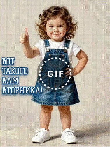 Милое и позитивное изображение маленькой девочки с кудрявыми волосами, одетой в джинсовый сарафан и белую футболку. Ребенок стоит в уверенной позе, показывая большой палец вверх, что символизирует одобрение, успех и хорошее настроение. На картинке наложен текст на русском языке:" Bот такого вам вторника!", что делает это изображение идеальной открыткой для пожелания отличного вторника в социальных сетях, мессенджерах или блогах. Эстетика фото передает радость, бодрость и позитивный настрой на весь рабочий день.