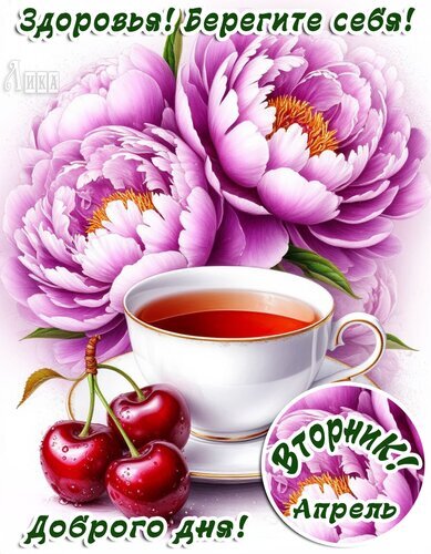 Теги:вторник, дни недели, вишня, доброго дня, здоровья, берегите себя, позитива, чай, пионы, цветы, красивая картинка