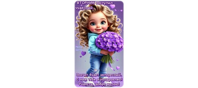 Вторник наступил чудесный, значит будет интересный. С ним тебя и поздравляю! Радости, добра желаю!