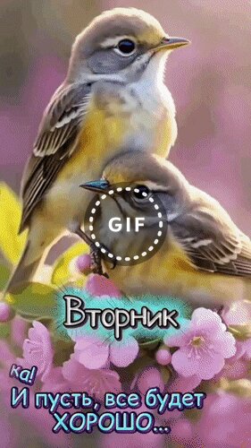 Красивое и вдохновляющее изображение с двумя милыми птичками на фоне нежных розовых цветов. На картинке размещен текст на русском языке: «Вторник ка! И пусть, все будет хорошо...». Эта душевная открытка идеально подходит для того, чтобы пожелать хорошего дня, поднять настроение и поделиться позитивными эмоциями в социальных сетях или мессенджерах. Иллюстрация выполнена в мягких пастельных тонах, создавая ощущение уюта, спокойствия и веры в лучшее.