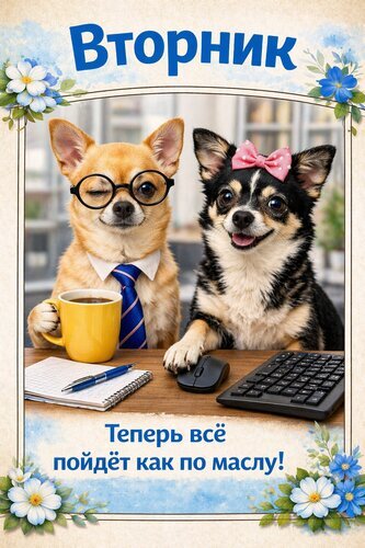 Забавное поздравительное изображение к вторнику с двумя очаровательными чихуахуа в образе офисных работников. Один пес в очках и галстуке с чашкой кофе, другой — рядом с компьютером. На картинке надпись на русском языке: «Вторник. Теперь всё пойдёт как по маслу!». Иллюстрация украшена нежными голубыми цветами и идеально подходит для отправки друзьям и коллегам в мессенджерах или социальных сетях для поднятия настроения в рабочие будни.