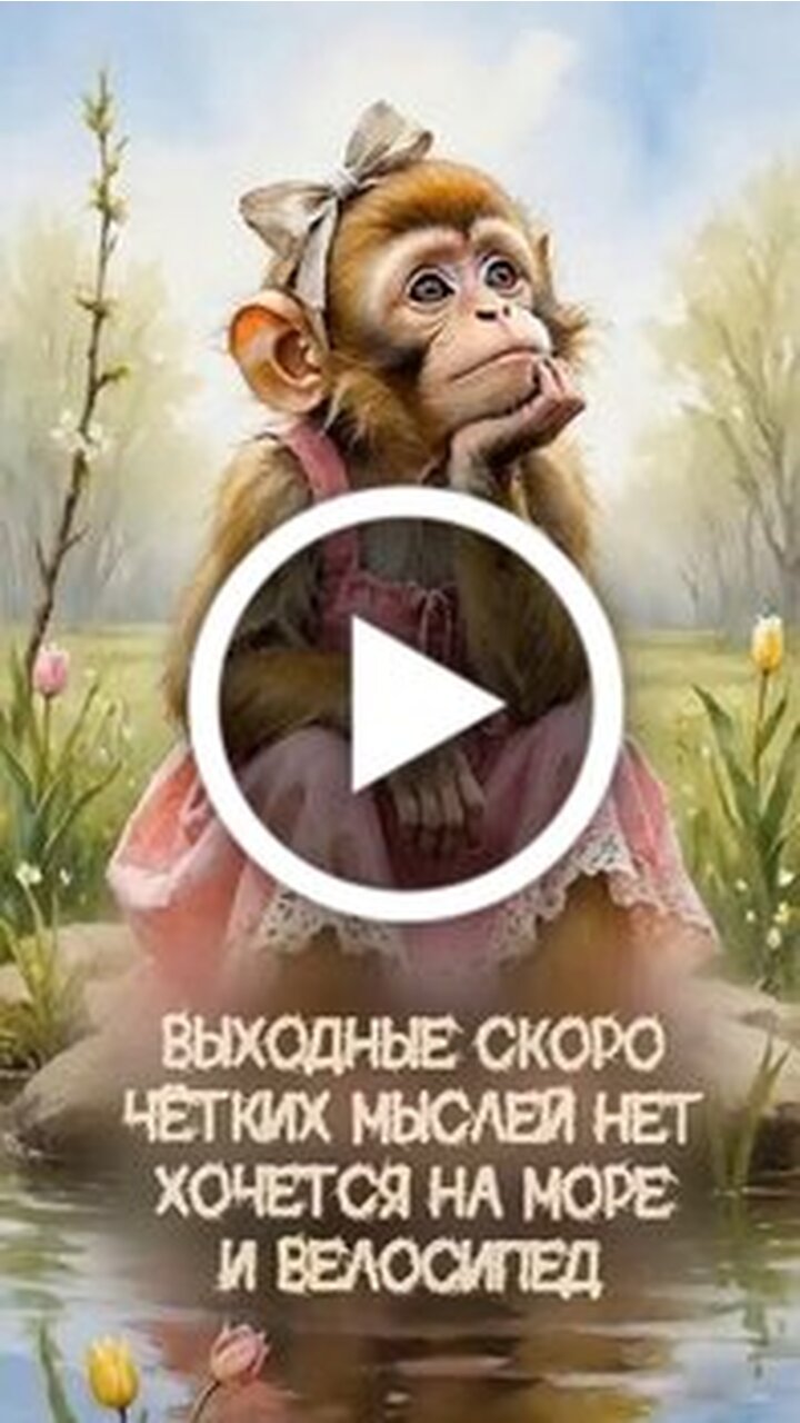 Это короткое и эмоциональное видео рассказывает о мечтательном настроении и предвкушении отдыха. На экране запечатлена маленькая обезьянка в розовом платье, которая сидит на камне и задумчиво смотрит вдаль. Сквозь облака проступают образы того, о чем она грезит: морская прогулка на яхте и активный отдых на велосипеде. Текст на видео передает состояние легкой рассеянности и сильное желание поскорее отправиться в отпуск, чтобы насладиться морем и активными развлечениями. Видео наполнено атмосферой ожидания выходных и приятных фантазий об отпуске.