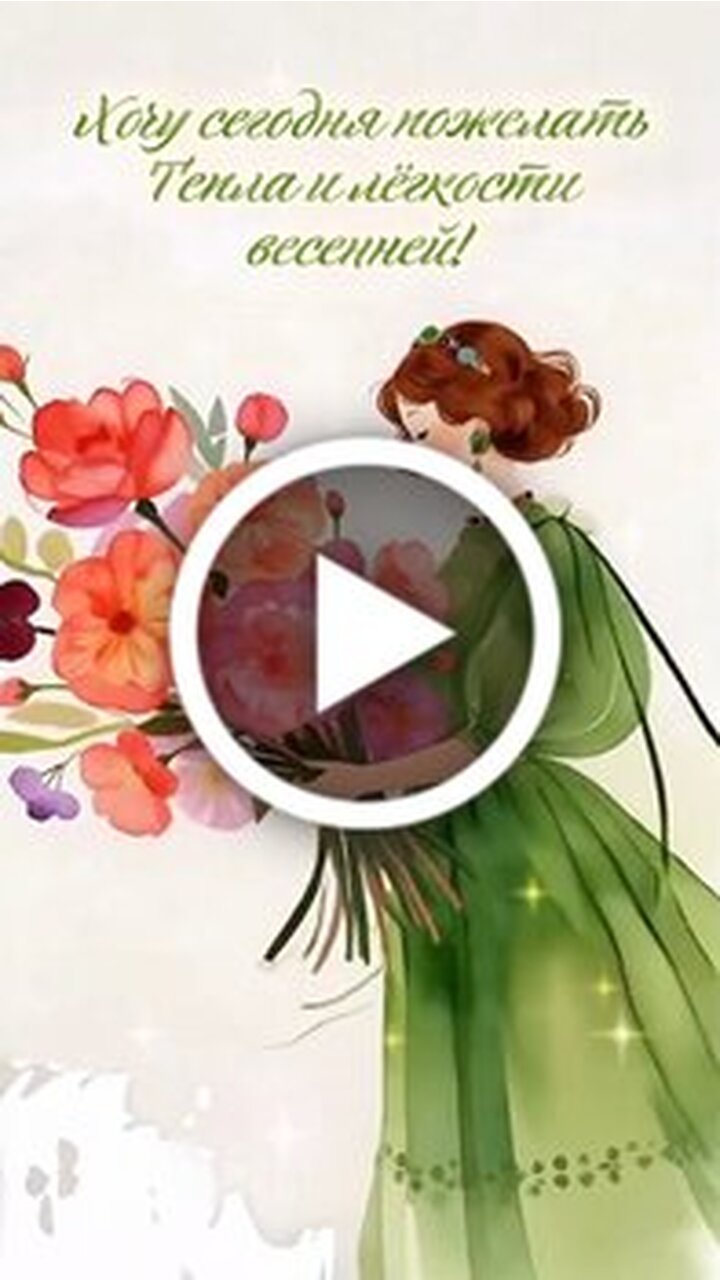 Красивое и вдохновляющее видео в художественном стиле. На нем изображена девушка в элегантном зеленом платье, которая держит в руках пышный букет ярких весенних цветов. Видео наполнено нежностью и теплом, создавая атмосферу уюта и радости. Поверх анимированного изображения накладывается текст с добрыми пожеланиями: тепла, легкости весны, приятных слов и добрых глаз, а также пожелание всегда находиться в чудесном настроении. Это идеальный ролик для того, чтобы подарить близким или друзьям порцию позитива и весеннего вдохновения.