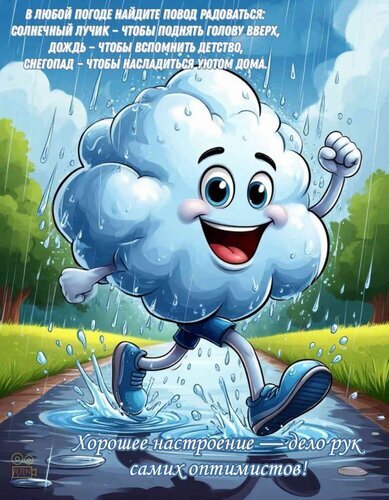 Иллюстрация с позитивным мультяшным персонажем — бегущим облаком, символизирующим оптимизм и радость. На картинке изображено облако с улыбающимся лицом, которое энергично бежит по лужам под дождем. В верхней части текста на русском языке содержится вдохновляющая цитата о том, как находить поводы для радости в любую погоду: солнечный луч, дождь или снегопад. В нижней части надпись: «Хорошее настроение — дело рук самих оптимистов!». Яркая, эмоциональная и мотивирующая графика, идеально подходящая для тем саморазвития, позитивного мышления и борьбы с хандрой.