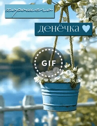 Красивая и вдохновляющая открытка с надписью «хорошего денёчка» и сердечком. На изображении запечатлен уютный летний пейзаж: подвесное кашпо с белоснежными цветами, висящее на фоне спокойной воды и зелени. Нежные белые цветы в голубом ведёрке создают атмосферу тепла, уюта и безмятежности. Идеальное изображение для пожелания доброго дня, поднятия настроения и отправки близким в мессенджерах или социальных сетях.