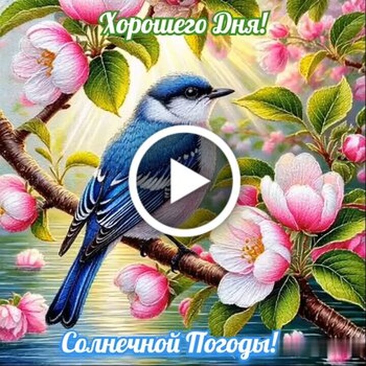 Красивое и позитивное видео с пожеланиями хорошего дня и солнечной погоды. В центре композиции изображена яркая синяя птица, грациозно сидящая на ветке цветущего дерева. Вокруг птицы распускаются нежные розовые цветы, создавая атмосферу весеннего тепла и уюта. Это видео наполнено светом и радостью, идеально подходящее для того, чтобы поднять настроение себе и вашим близким в начале дня. Поделитесь этим добрым пожеланием, чтобы подарить окружающим частичку солнечного настроения.