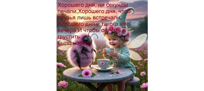 Теги:хорошего дня, ни секунды печали, чтоб друзья лишь встречали, хорошего дня и такого же вечера, и чтобы скучать и грустить было нечего