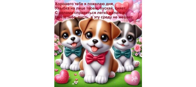 Теги:хорошего тебе я пожелаю дня, улыбка на лице твоем, пускай, сияет, с делами справиться легко желаю я, ничто тебе, пусть, в эту среду не мешает