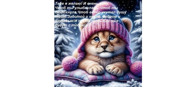 Теги:хорошего вечера, очень, беспечного, тебе, желаю, хочу, чтоб ты улыбнулась, чтоб ты отдохнула, чтоб, вечер, укутал, душу, твою