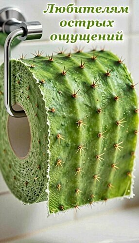 Креативное и необычное изображение рулона туалетной бумаги, стилизованного под кактус с колючками. На картинке крупным планом показана текстура зеленой «колючей» бумаги, подвешенная на хромированном держателе. Надпись на русском языке «Любителям острых ощущений» добавляет ироничный и юмористический подтекст. Идеально подходит для использования в статьях о причудливых товарах, мемах, юмористических подарках или для иллюстрации концепции «острых ощущений» в неожиданном контексте.