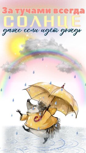 Милая и вдохновляющая иллюстрация с ежиком в желтом дождевике под зонтом. На фоне — дождь, радуга и мягкое солнечное сияние сквозь облака. Сверху на картинке надпись на русском языке: «За тучами всегда солнце, даже если идёт дождь». Изображение наполнено позитивом, оптимизмом и уютом, идеально подходит для открыток, постов о мотивации, психологической поддержки и создания хорошего настроения.