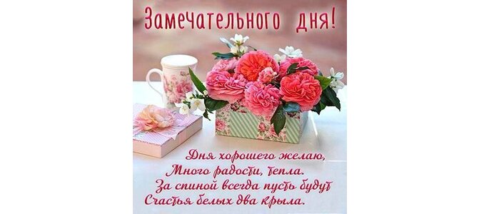 Замечательного дня! Дня хорошего желаю, много радости, тепла. За спиной всегда пусть будут счастья белых два крыла.