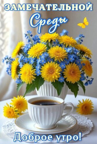 Красивая и яркая поздравительная открытка к среде. На изображении представлен пышный букет желтых хризантем и голубых незабудок в белой вазе. На переднем плане стоит чашка ароматного кофе на блюдце, стоящая на кружевной салфетке. В верхней части картинки надпись курсивом «Замечательной среды», а внизу — «Доброе утро!». Теплая и уютная атмосфера утреннего кофе и цветов, идеально подходящая для отправки друзьям и близким в мессенджерах и социальных сетях.
