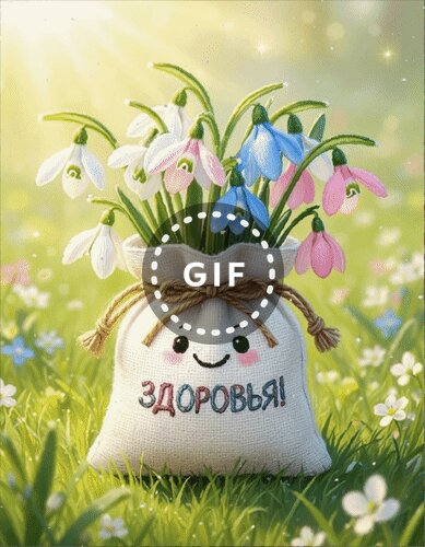 Художественная иллюстрация, изображающая милый белый мешочек с улыбающимся лицом, стоящий на зеленой траве. На мешочке надпись на русском языке «ЗДОРОВЬЯ!». Из мешочка растет пышный букет нежных подснежников различных цветов: белых, розовых и голубых. Изображение выполнено в светлых, весенних тонах с эффектом мягкого солнечного сияния и мерцающих бликов, создавая атмосферу радости, тепла и пожелания благополучия.