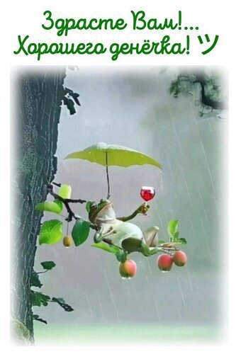 Милая и забавная открытка для пожелания доброго утра и хорошего дня. На изображении изображена зеленая древесная лягушка, которая отдыхает на ветке дерева под маленьким зеленым зонтиком во время дождя. Лягушка расслабленно лежит, держа в лапке бокал красного вина, создавая атмосферу уюта и беззаботности. Сверху нанесена надпись на русском языке красивым зеленым шрифтом: " Здрасте Вам!... Хорошего денёчка!". Идеально подходит для отправки друзьям и близким в мессенджерах (WhatsApp, Viber) или социальных сетях для поднятия настроения.