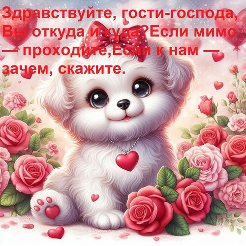 Открытка "Здравствуйте, гости-господа, Вы откуда и куда? Если мимо — проходите, Если к нам — зачем, скажите."
