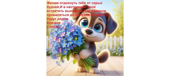 Теги:желаю отдохнуть тебе от серых будней, и в настроении свой встретить выходной, под одеялом проваляться до полудня, в субботу будут рядом близкие с тобой
